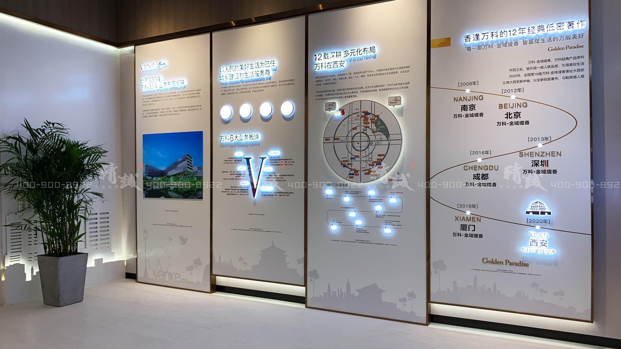 十二载深耕布局,十二年经典著作,墙面的四幅展板记录着万科在西安发展的每一个历程。