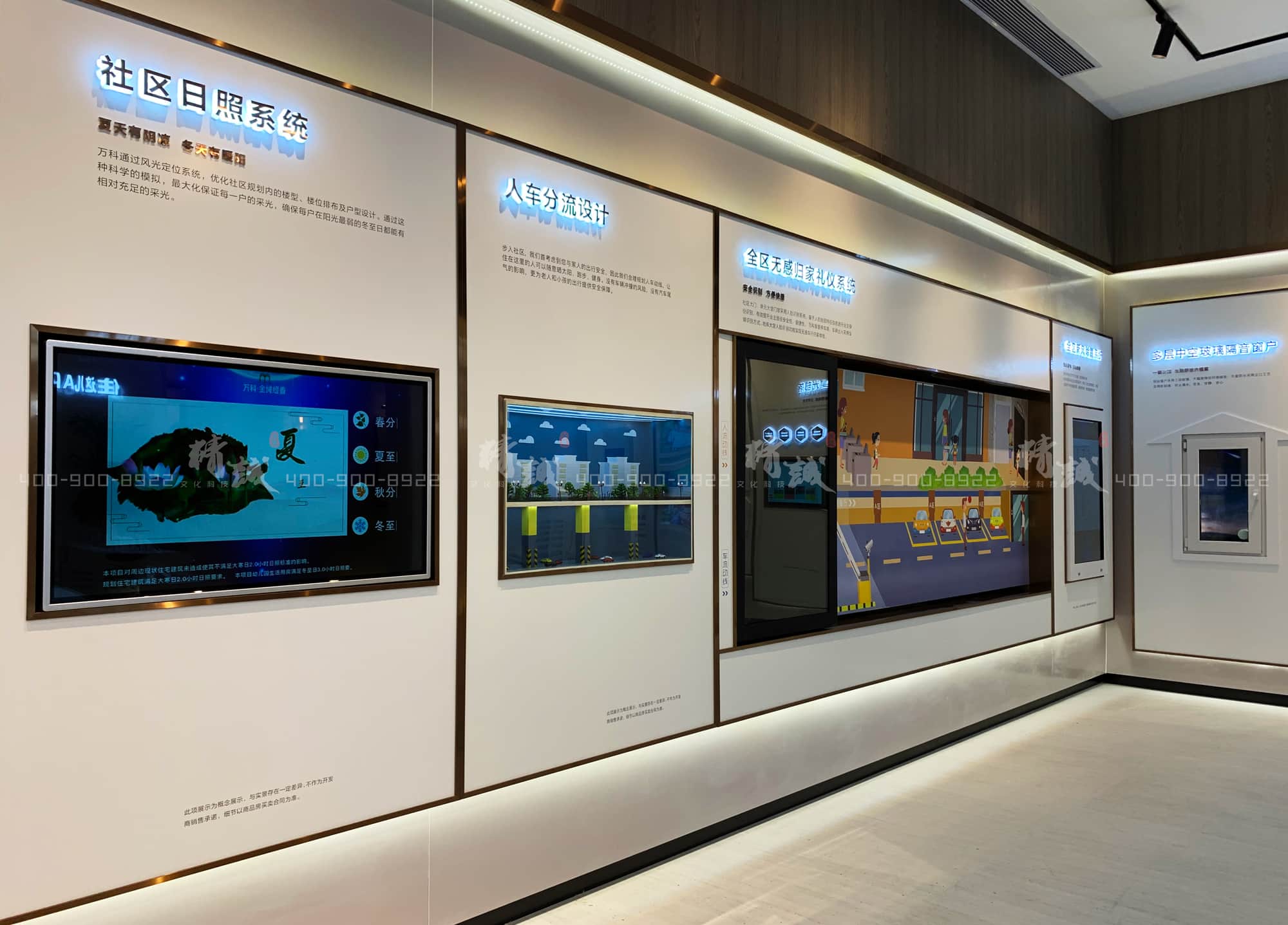 从触摸屏的社区日照系统展示,到人车分流的微缩场景,再到互动滑轨屏展示的全区无感归家礼仪系统。