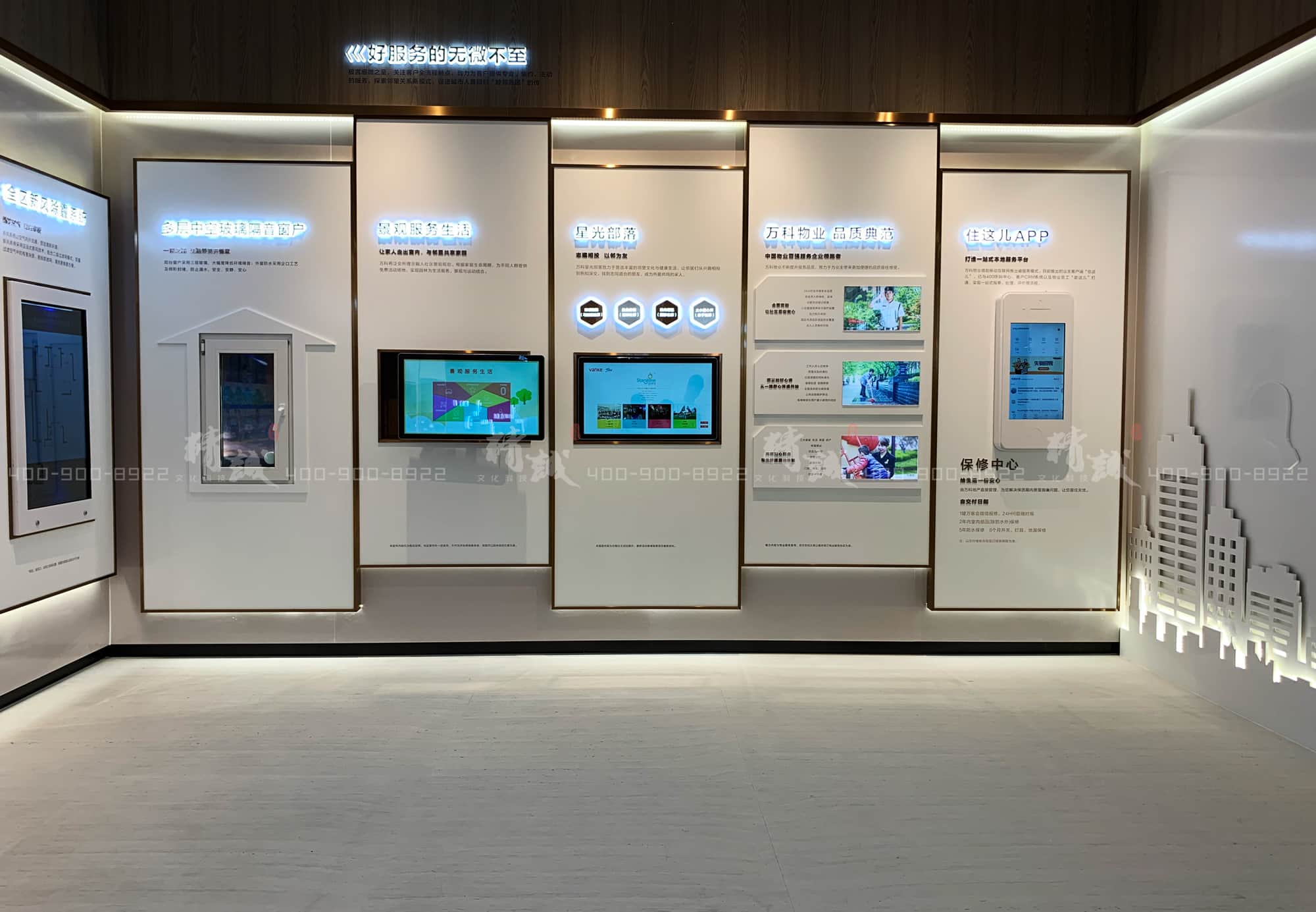 细微知著,墙面展板展现了万科为业主提供无微不至的好服务:有友好和谐的邻里活动,有全国百强的物业为业主提供便捷的高品质居住生活,更有业主专属客户端——“住这儿APP”为各位业主提供一站式的本地服务。