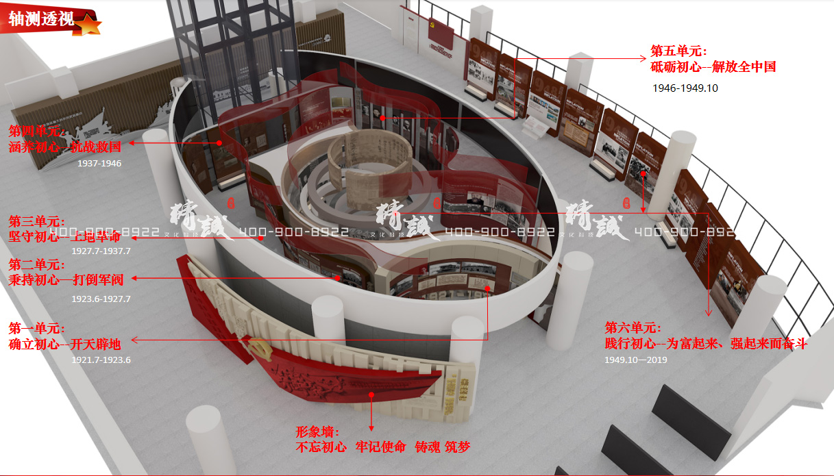 利用博物馆中厅现有硬件环境,搭建独立成章又和展馆其他空间贯通的展陈空间,展区整体设计遵循简约而不简单,丰富而不复杂的理念,合理巧妙地运用多种展陈手段和丰富的史料展品,突出每一部分展陈的重点内容,构筑一个党性与思想性及艺术性高度统一的党性文化、党性教育展示空间。突破传统的展陈封闭环境,形式上注重前瞻性、可持续利用性,可拆卸性、在创新上下功夫,使之与新形势下的发展格局相适应。