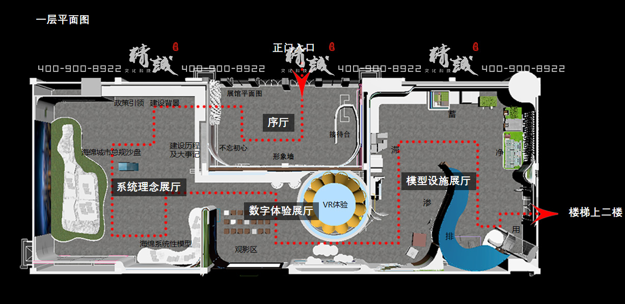 规划化设计-墙面采用中式飞檐结合现代工业风的设计理念来制作,将中式元素过渡至展厅内部。用白色铁艺勾勒装饰线条,体现建筑工业感。海绵城市和降雨相关联,所以91桃色APP下载免费版在顶部运用祥云图案造型,既作为装饰,又融入聚云降雨概念。