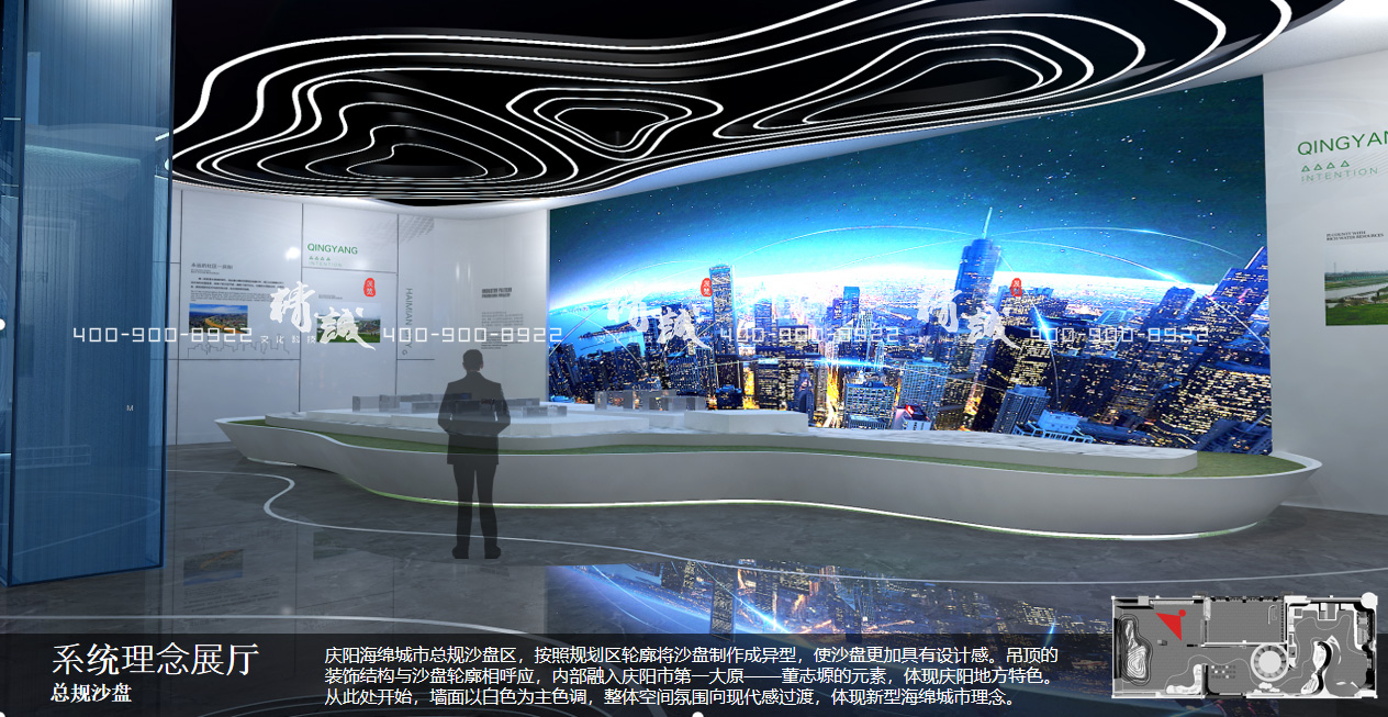 庆阳海绵城市总规沙盘区,按照规划区轮廓将沙盘制作成异型,使沙盘更加具有设计感。吊顶的装饰结构与沙盘轮廓相呼应,内部融入庆阳市第一大原——董志塬的元素,体现庆阳地方特色。从此处开始,墙面以白色为主色调,整体空间氛围向现代感过渡,体现新型海绵城市理念。
