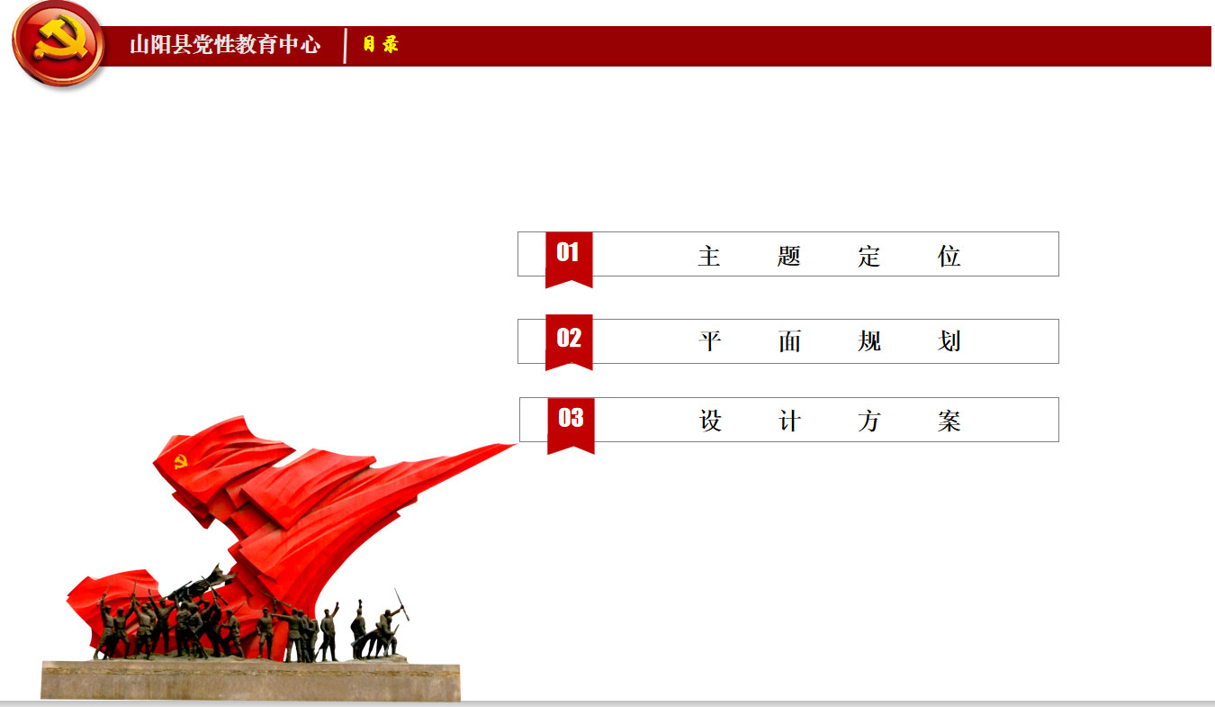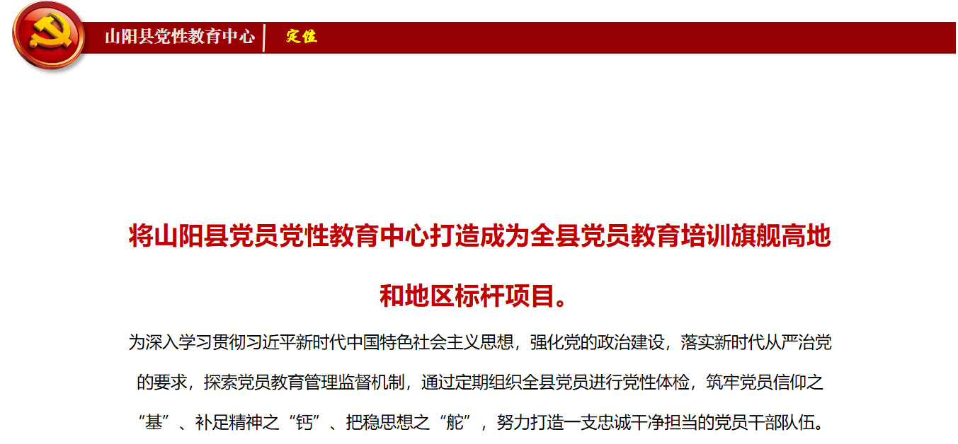 商洛山阳县党性教育中心展厅设计概念以政治建设为统领,以“强化政治建设、提升党性修养、争做合格党员、勇于担当作为”为目标,通过组织党员学党史、知党情,学典型、鼓精神,受警示、知敬畏,守初心、做先锋等系列教育,激励党员牢记使命、创先争优,在建设“三强两好”美丽幸福新山阳的征程中不辱使命、砥砺前行。