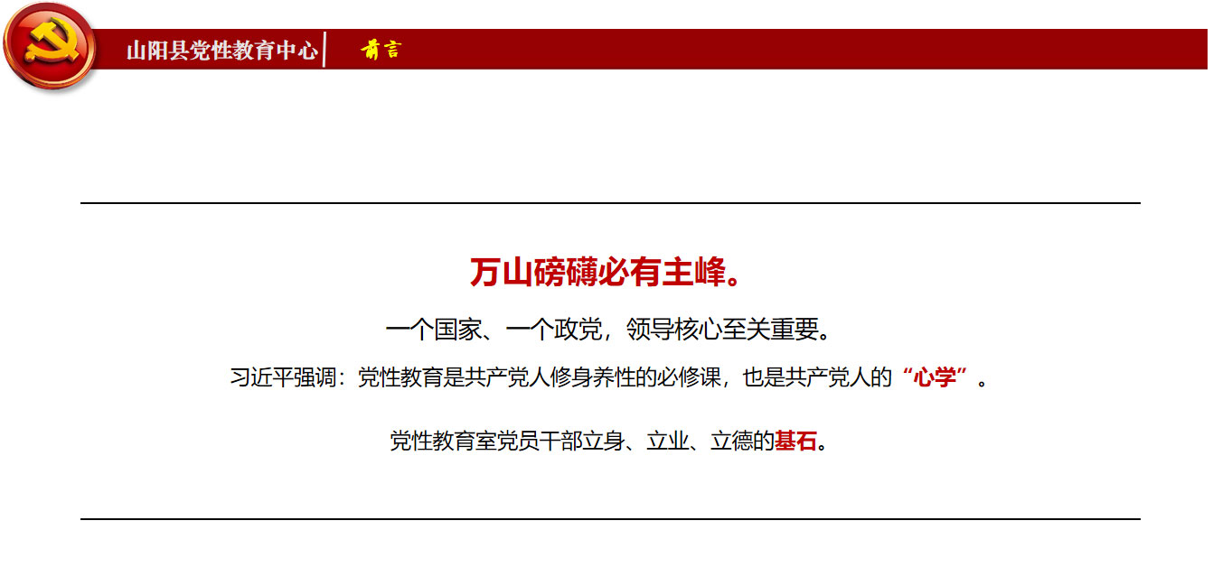 序厅是整个展厅调性奠定的基础空间、气势庄重的序厅形象设计,为参观者步入主厅前做足心里铺垫和情感熏陶。该序厅利用右侧墙体形成展厅形象墙,山阳县党员党性教育中心以及展厅设计主题一目了然,顶部党徽造型,整个序厅开阔、规整。