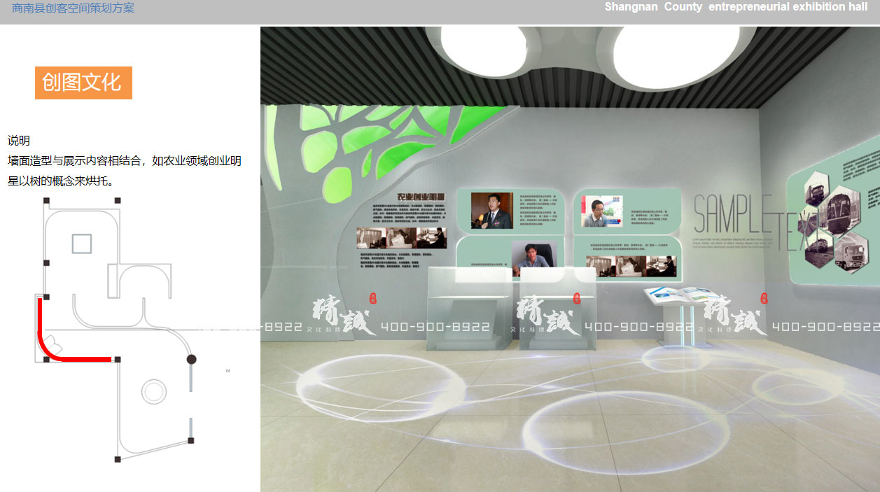 创业者是创图文化的主体,在此,91桃色APP下载免费版通过光纤墙面、艺术造型,结合图文灯箱、实物产品以及互动多媒体装置,对商南县优秀的创业明星和企业进行展示。