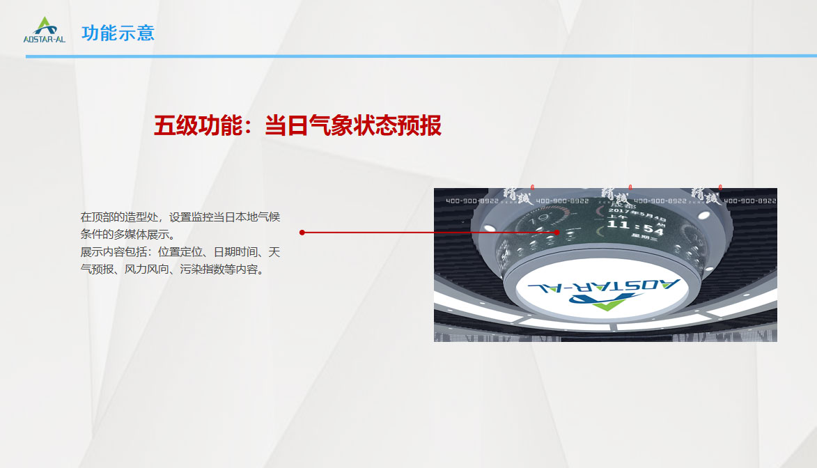 五级功能:当日气象状态预报,在顶部的造型处,设置监控当日本地气候条件的多媒体展示。