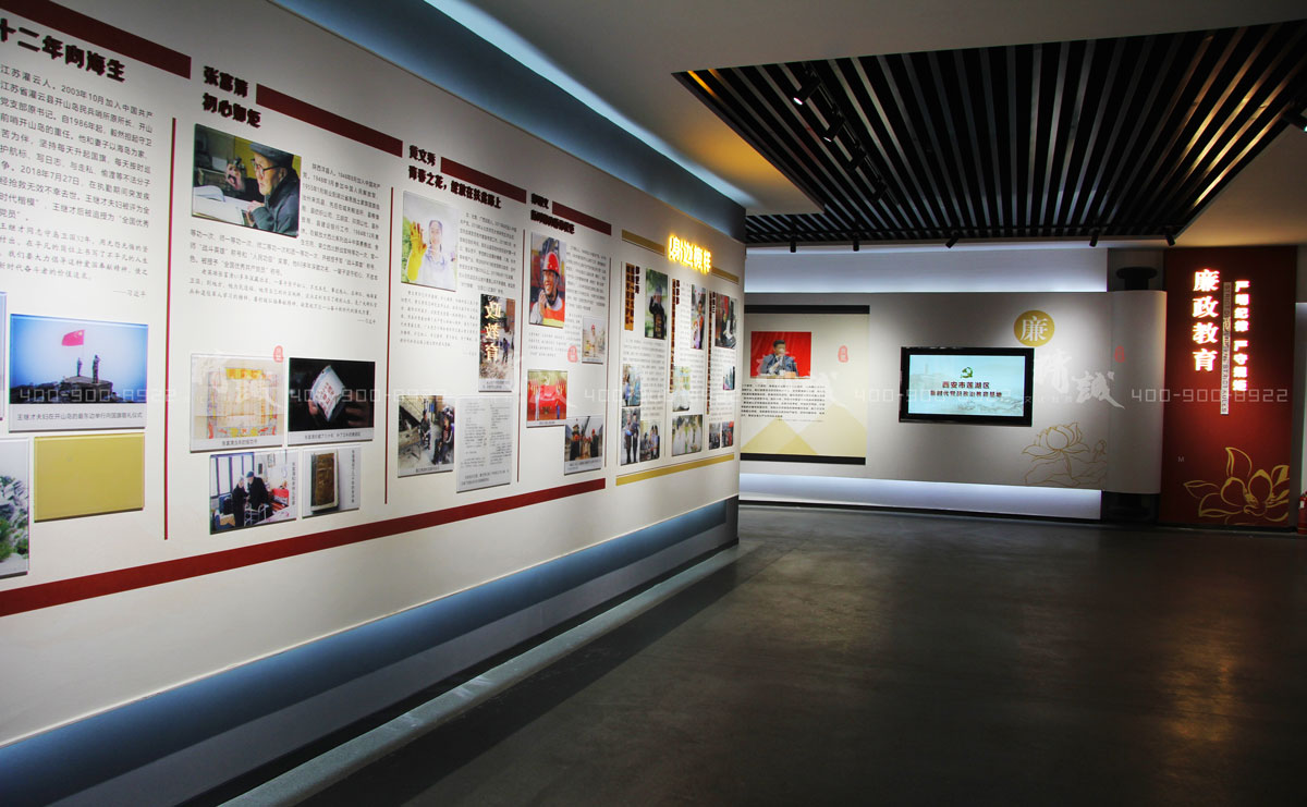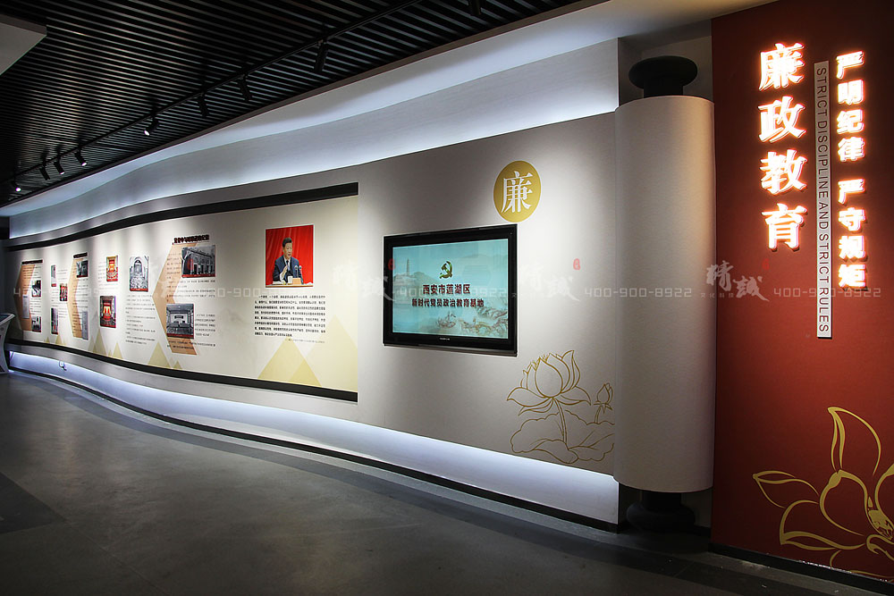 配合廉政警示教育,采用铁丝网造型墙和吊顶警钟设计,展示中央纪检监察机构历史沿革、莲湖纪检监察机构历史沿革以及十八大以来中省市区反面典型案例,从视觉感官层面引导广大党员干部自警自省,自重自律。