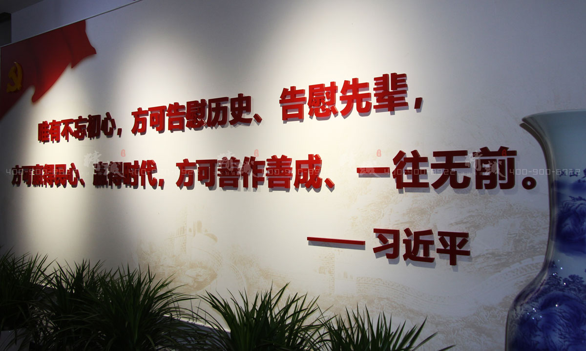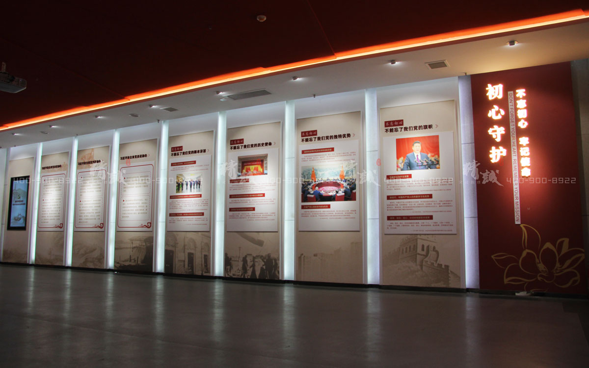 初心守护厅以“不忘初心、牢记使命”为主题。进入展厅,庄严的党旗和醒目的入党誓词令人肃然,吊顶采用大面积红色内嵌发光灯带寓意党的光辉万丈,两侧墙面展板展示习近平总书记关于初心的重点论述,党旗处设置投影屏,播放党性教育影片。这一板块将静态画面的“初心”论述与动态教育的影片相辅设置,能够调动党员干部们的学习热情、加深党员干部对“初心”的理解。