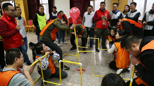 团队成员要根据培训师的规则合作组装模具,并利用组装的模具吹爆气球。