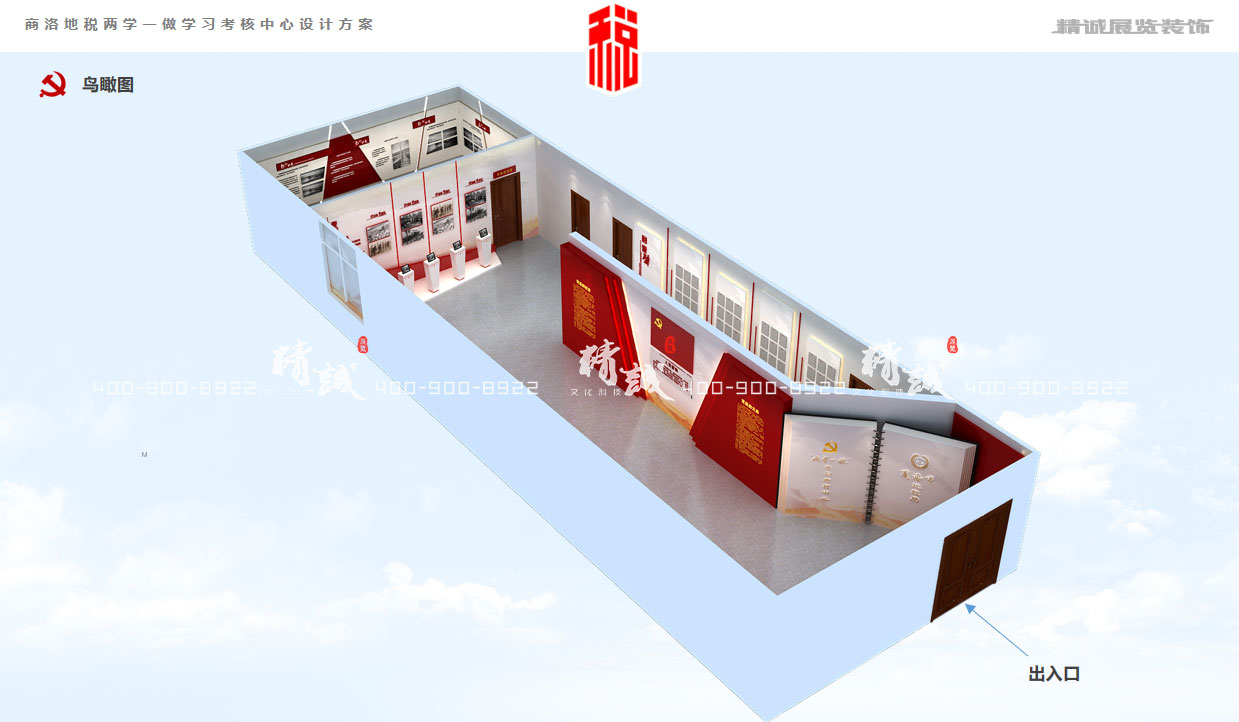 展厅以党旗、党徽和税徽作为贯穿整个展陈空间的形象元素,突出表现商洛市地税局强烈的党建学习氛围,打造深刻的党建文化呈现基地。